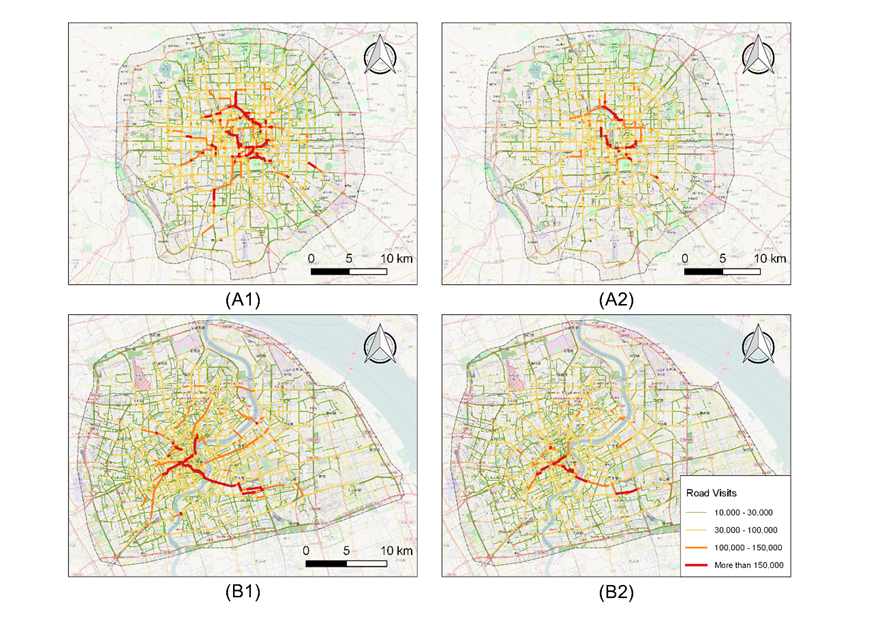 1小区开放前后路网经过频次:(A1)北京实施前,(A2)北京实施后,(B1)上海实施前,(B2)上海实施后