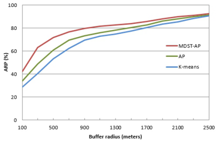 此外,我们使用点匹配准确率(ARP)来量化MDST-AP算法的准确度。图2显示,在1000米缓冲区内,k-means算法、AP算法和MDST-AP算法的平均ARP分别达到72.51%、75.18%和81.47%。一般来说,在进行时空数据聚类时,MDST-AP算法要比k-means算法和AP算法更可靠。