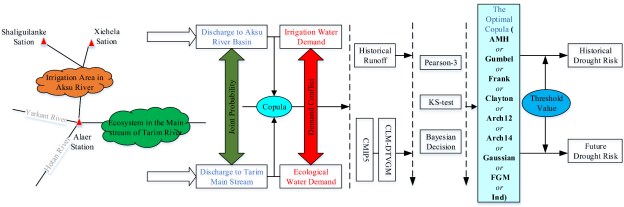 因此,受中国科公司先导A项目和国家自然科学资金的支持,本研究着眼于中国“一带一路”经济发展政策沿线-塔里木河流域,从该流域上游绿洲农业用水严重挤占中下游生态用水的事实出发,借助于水文资料、CMIP5数据和CLM—DTVGM(Community Land Model-Distributed Time Variant Gain Model,陆面模式-时变增益模型)水文模型,权衡流域内的绿洲农业发展和生态发展,以径流多年均值为阈值,基于贝叶斯方法确定了最佳的Copula函数形式。随后,基于最佳的Copula函数形式确定了山区来水量及上游向中下游输水量的联合分布关系,以通过K-S(Kolmogorov-Smirnov)检验的Pearson-III概率分布为边缘分布,确定了塔里木河流域历史水文干旱风险和未来三种气候情景下(RCP2.6,RCP4.5,RCP8.5)水文干旱风险,具体研究思路见图2。