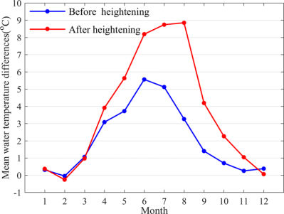 (2)大坝的加高加剧了对下游河流的冷却效应,并延长了冷却效应持续时间。月均水温差异的峰值由加高前的5.56°C提高至8.85°C,且存在显著水温差异(>5°C)的持续时间由加高前的2个月(6-7月)延长至加高后的4个月(5-8月);