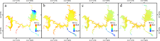 水温纵剖面表明,夏季大坝下游河流水温较上游水库的降幅可达10°C;春季和秋季可达3-4°C;冬季则不明显(图2)。春、夏季的河道水温降低将对下游汉江四大家鱼的产卵与生长产生不良影响。
