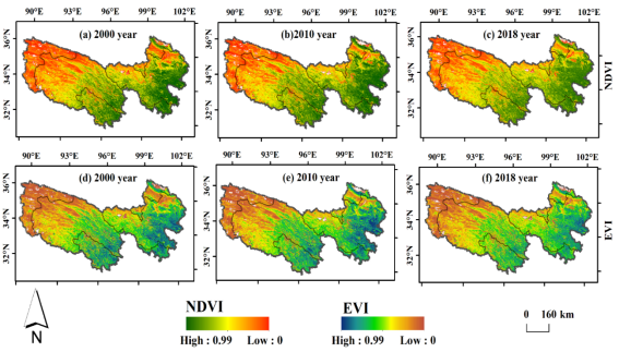 图5. 三江源区植被指数(NDVI、EVI)的时空分布。(a-f)分别代表2000/2010/2018年中5月、9月的NDVI与EVI。