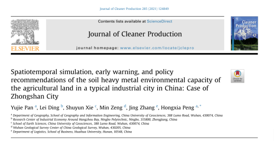 成果信息:Pan Y, Ding L, Xie S, et al. Spatiotemporal simulation, early warning, and policy recommendations of the soil heavy metal environmental capacity of the agricultural land in a typical industrial city in China: Case of Zhongshan City[J]. Journal of Cleaner Production, 2021,285:124849.