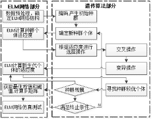 遗传算法具有良好的全局搜索能力,可扩展性良好,易于与其他算法相结合,本文采用遗传算法优化的极限学习机算法,通过调整和优化输入权值矩阵和隐含层偏差,提高极限学习机网络的精度。首先利用遗传算法全局搜索特性,优化极限学习机的输入权值和隐含层偏差,使得网络输出能够满足误差要求,若未满足,调整输入权值和隐含层偏差等参数并重新进行训练。与传统的需要优化输入权重、隐含层偏差和输出权重的神经网络相比,遗传算法只需要对输入权重和隐含层进行优化,从而减少了计算量,研究的具体流程如图1所示: