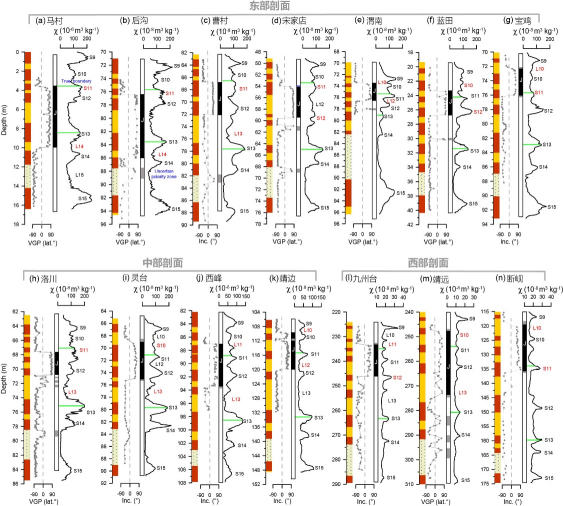 (3) MBB下移的深度在不同剖面中存在0-9 米的变化范围(图6),如此大的下移深度以及这种空间上不按气候特征变化的现象无法用lock-in效应来解释。本研究认为,由于L8和S7是在松山-布容古地磁极性倒转过程中堆积的地层,这一时期的弱地磁场造成了L8和S7获得的原生剩磁不稳定,其会受到布容正极性时的重磁化而导致实测MBB发生不同程度的下移,但其始终位于MB转换过程的弱地磁场时期内。由于L8和S7在布容正极性时后再也没有经历长时间的负极性期的重磁化,因此实测MBB仅能发生下移。