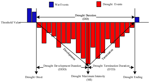 干旱事件被认为是一种广泛分布的自然灾害,无论在干旱地区还是在潮湿地区都有发生。干旱发展过程缓慢,只有在产生严重影响时才会变得明显。由于人口的增长和农业、能源、工业等部门的扩张,水的需求量和全球干旱程度都显著增加。根据缺水的不同水平,干旱事件可分为气象、水文、农业和社会经济干旱。在气候变化下,干旱事件对世界不同地区有很大影响,区域干旱特征的定量评价对于规避区域干旱风险具有重要意义。以前的研究集中在水文干旱的频率、重现期和持续时间的分析上,然而,这些水文干旱分析不能为未来的干旱预警提供有效的信息。