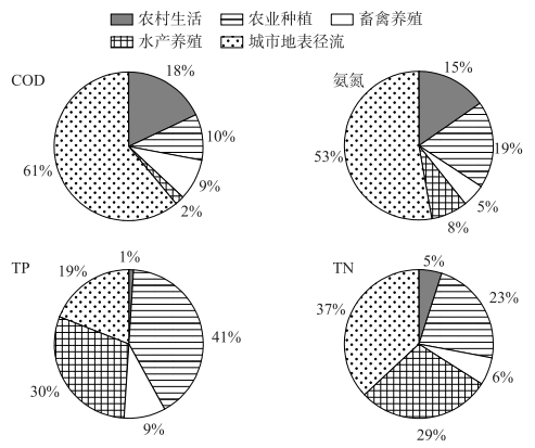 根据研究结果,从图4中看出,COD和氨氮负荷最大的均为城市地表径流,分别占污染物总排放量的61%、53%.从图4中看出,总氨负荷最大的是城市地表径流源,占比37%,水产养殖次之(29%)。总磷负荷最大的是农业种植,占比41%,水产养殖次之(30%)。当前形势下,农田种植和养殖是大部分区域总磷负荷的主要贡献源,存在治理难度大、控源成本高等问题。后官湖流域的水产养殖和农业种植对总氮与总磷具有较大的贡献,成为造成后官湖水质恶化和超标的主要原因。