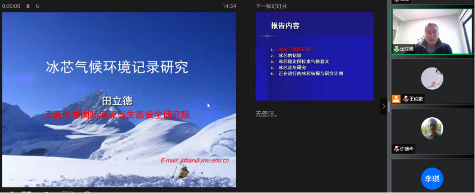 2022年12月15日,应bv伟德王伦澈教授的邀请,云南大学田立德研究员做客bv伟德中国官方网站(武汉)第115期名家论坛暨校庆七十周年学术交流会,以线上形式作题为“青藏高原冰芯气候环境记录研究”的学术报告,受到师生的热烈欢迎。报告由王伦澈教授主持,线上与会人数共计逾100人。