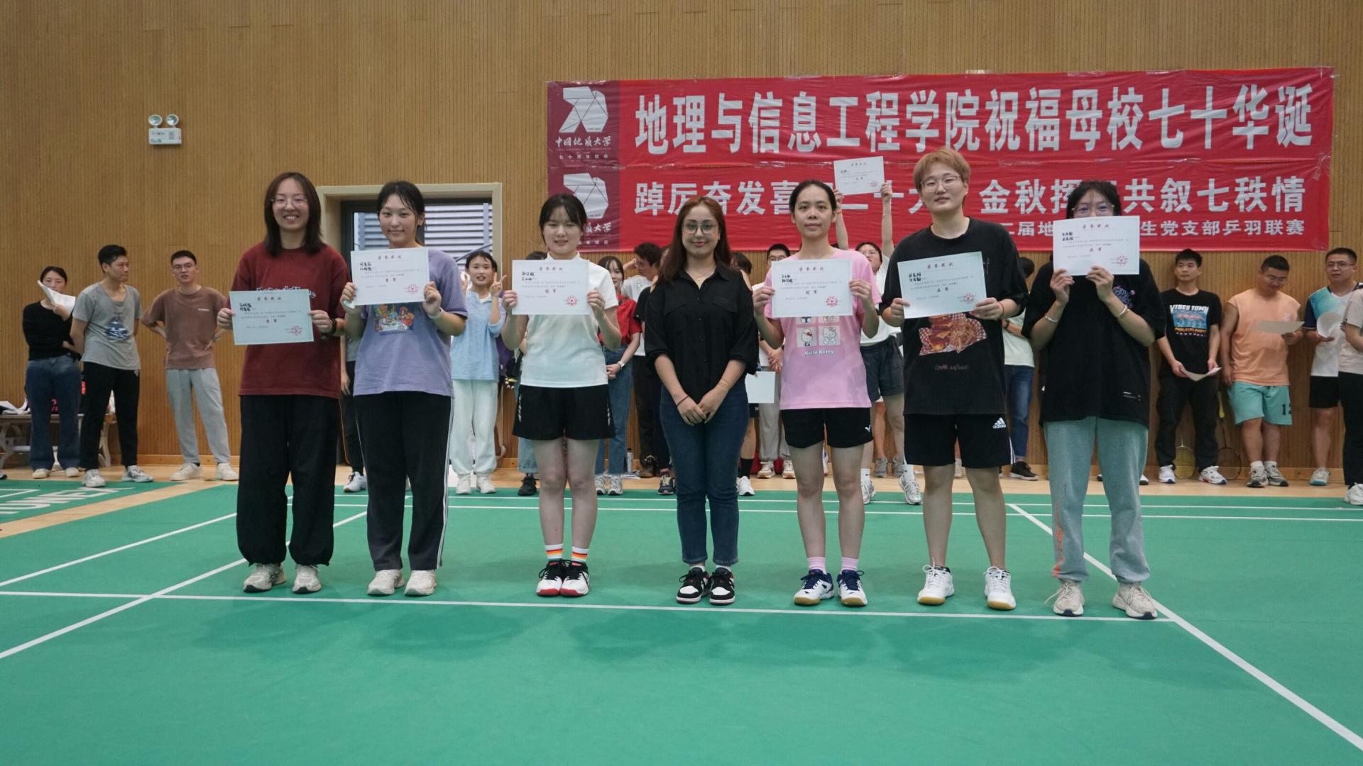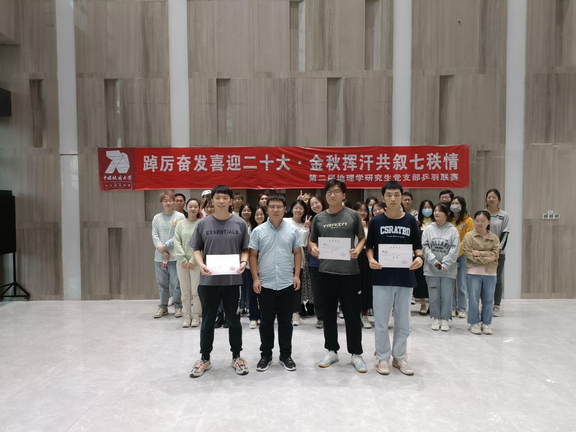 乒乓球项赛事共设立男单、女单、男双、女双、混双5个项目,参赛队伍达40队,五个项目共对阵40场。经过激烈角逐,空间规划团队党支部王凯、郭倩钰分别斩获男单、女单冠军;空间规划团队党支部王凯、张印和全球变化团队党支部任明煊、程楠分别荣获男双、女双冠军;环境遥感团队党支部黄荷、洪郁宁获得混双冠军;空间规划团队党支部荣获乒乓球项赛事团体总分第一名。刘剑宇和罗增良分别为获奖选手进行颁奖并进行合影留念。